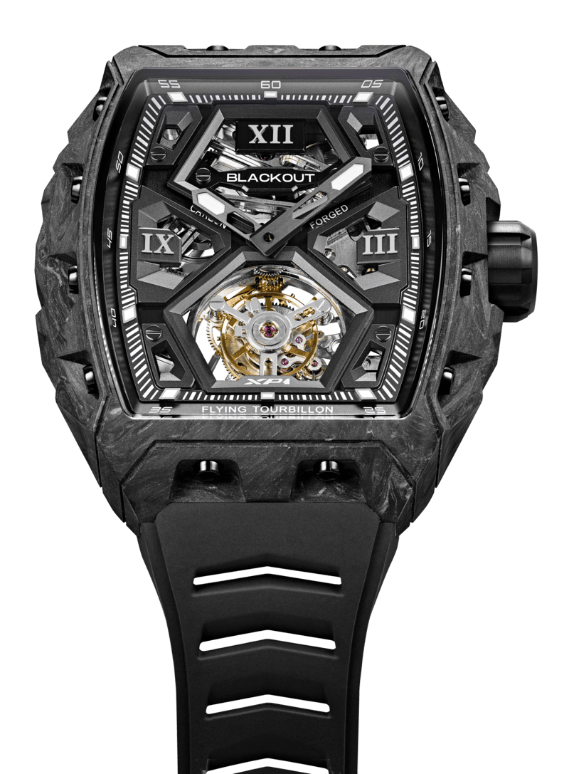Roman numerals at 12, 3 and 9 are represented as XII, III and IX, while the XP1 font sits under the flying tourbillon text centrally at 6. Blackout sits under the XII numeral in a central location on the dial.