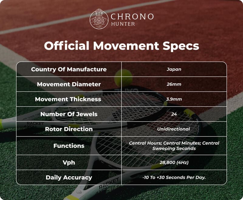 The movement belongs to the Miyota 9000 series, which was introduced to compete with Swiss movements such as the ETA 2824-2 and Sellita SW200.