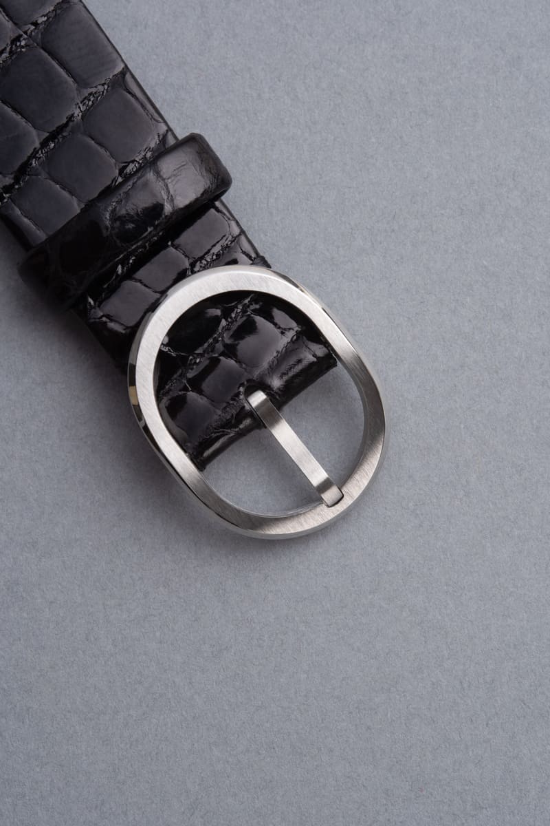 Choice of either blue or brown alligator-embossed calf leather (18-14mm) |