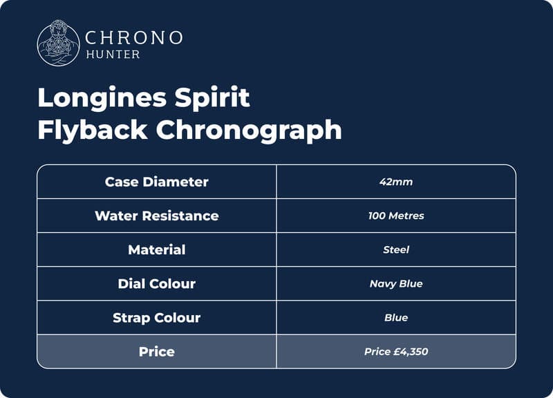 Introduced in 2023, The Longines Spirit Flyback Chronograph boasts the complicated flyback function.