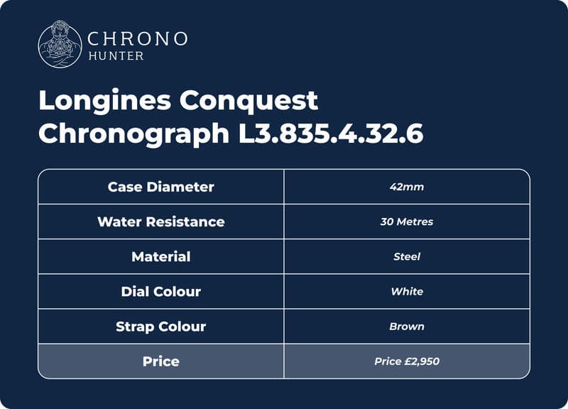 - You can buy a Longines Conquest Chronograph L3.835.4.32.6 at retail for £3,650 as of March 2026