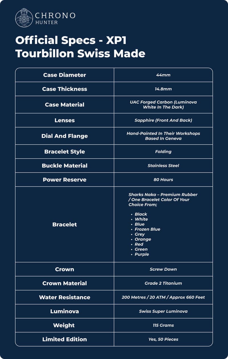 Official Specs - XP1 Tourbillon Swiss Made