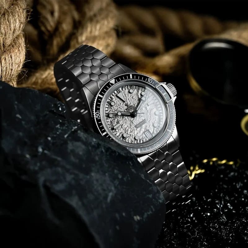 The Yema Superman Titanium MoonTide comes into its own with its lunar vibes that can be seen across the texture patterned dial. Evoking the surface of the moon, it has been produced by way of an oil-press procedure on a sandblasted titanium base.
