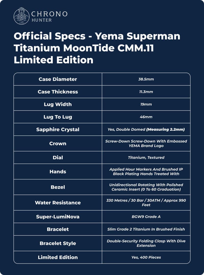 Official Specs - Yema Superman Titanium MoonTide CMM.11 Limited Edition