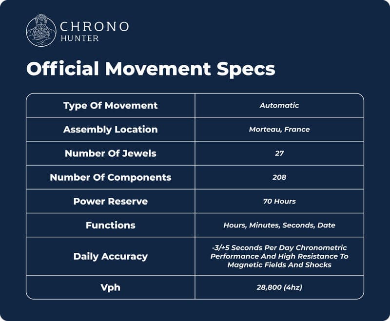 Like its predecessor, it operates at a frequency of 4 Hz (28,800 vibrations per hour), offering stable timekeeping and smooth seconds motion. It delivers an extended power reserve of around 70 hours, achieved through an optimised barrel and energy management system.