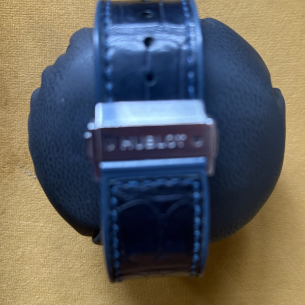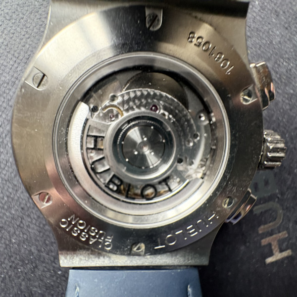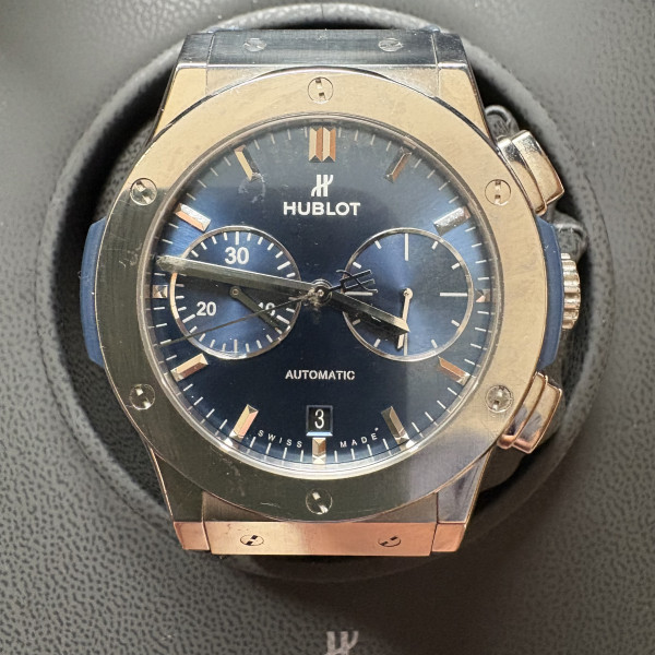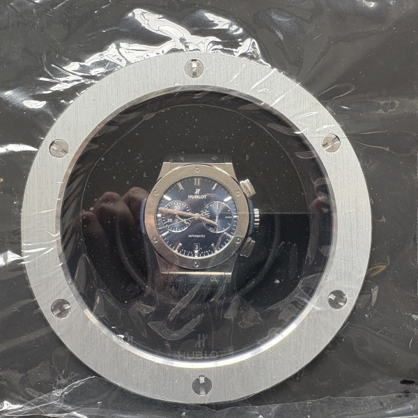 Hublot Classic Fusion 521.NX.7170.LR with blue dial is a sleek and modern luxury timepiece that embodies Hublot’s “Art of Fusion” philosophy. The 45mm titanium case provides lightweight durability and a contemporary aesthetic, complemented by a polished b