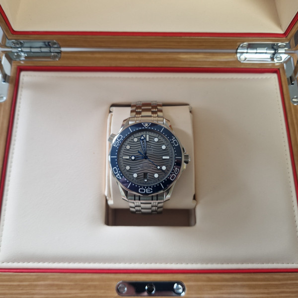 Omega Seamaster 210.30.42.20.06.001 stainless steel with grey wave dial, Co-Axial Master Chronometer movement and 300m professional dive performance.