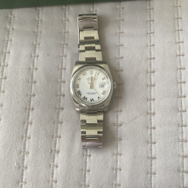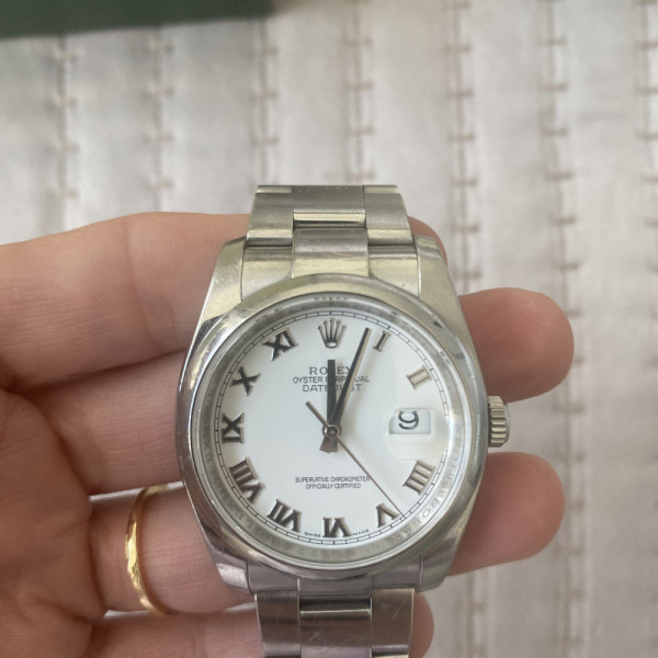 Rolex Datejust 116200 features a refined white dial, smooth bezel, and automatic Caliber 3135 movement in a 36mm stainless steel Oyster case.