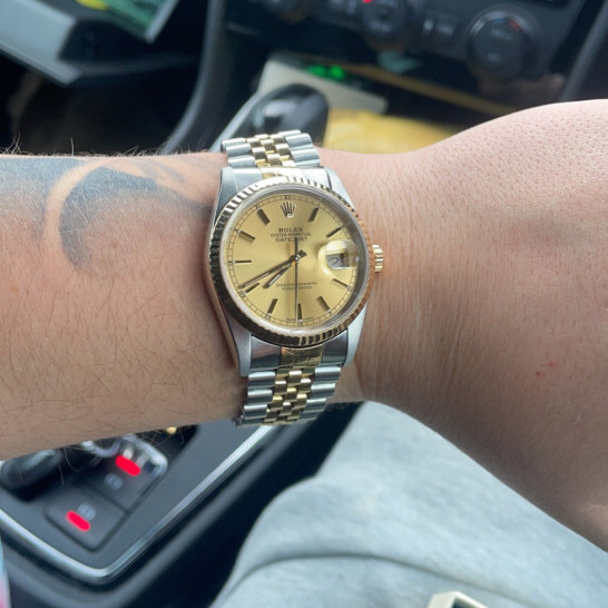 Rolex Datejust 16233 with champagne dial, fluted bezel, and two-tone Jubilee bracelet. A classic, balanced, and highly wearable 36mm Rolex icon.
