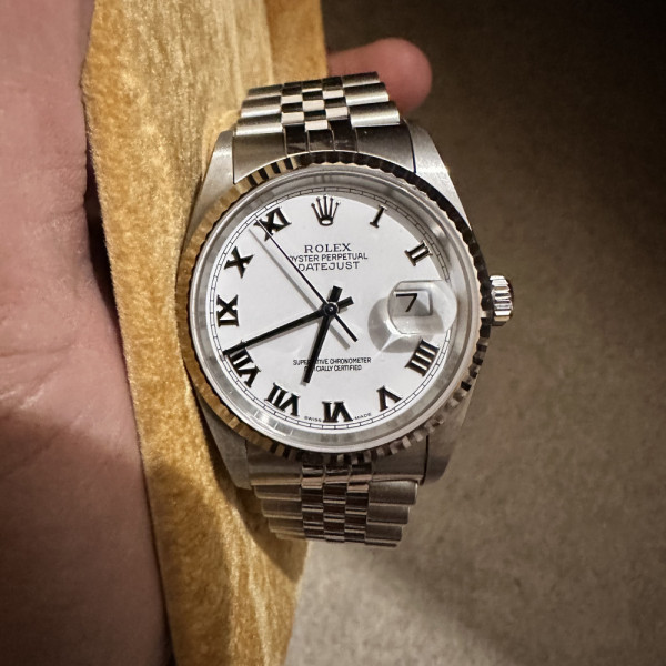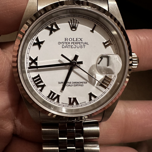 Rolex Datejust 16234 with white dial, 36mm steel case, white gold fluted bezel, and Jubilee bracelet for classic and versatile elegance.