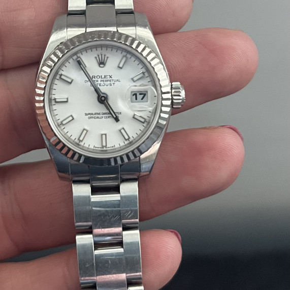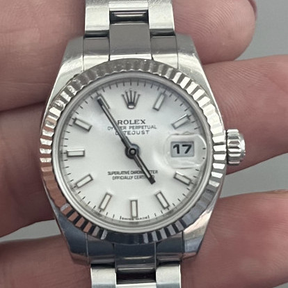 Rolex Datejust 179174 with white dial, 26mm steel case, smooth bezel, and Oyster bracelet. A compact, classic, and versatile Rolex for everyday wear.