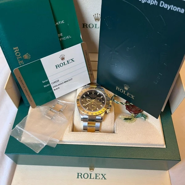 Rolex Daytona 116523 features a 40mm steel and yellow gold case, black dial with gold sub-dials, and Caliber 4130 automatic chronograph movement.