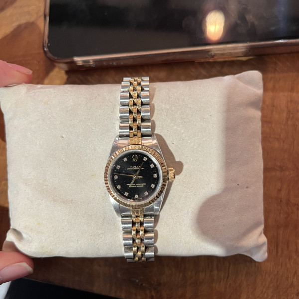 The Rolex Oyster Perpetual 67193 is a timeless luxury watch that combines elegance with Rolex’s renowned Swiss craftsmanship. Crafted in stainless steel and 18ct yellow gold, this 26mm model features a striking black dial with polished hour markers and lu